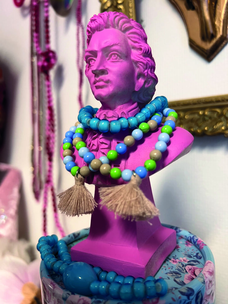 Hon beskriver sig själv som en kreativ själ. Hon målar, gör keramik, klär om möbler, skapar smycken och syr om plagg. Mer kreatör än konstnär, som hon själv uttrycker det. Hela livet har hon dragits till färger, material och möjligheten att förvandla något gammalt till något nytt.