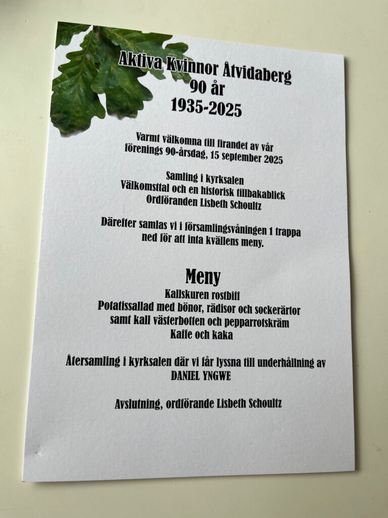 I år firas alltså 90 år av kvinnokraft i Åtvidaberg – ett jubileum som bär både på stolta traditioner och på framtidstro. Jubileet firades måndagen den 15 september med middag och underhållning.