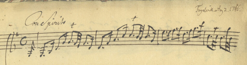 Romans 15:e symfoni skriven på Fågelvik 2 augusti 1746 för två violiner, två horn och bas, detta är första violinstämman. Roman anger stämningsläget ”Con Spirito”, dvs med känsla.